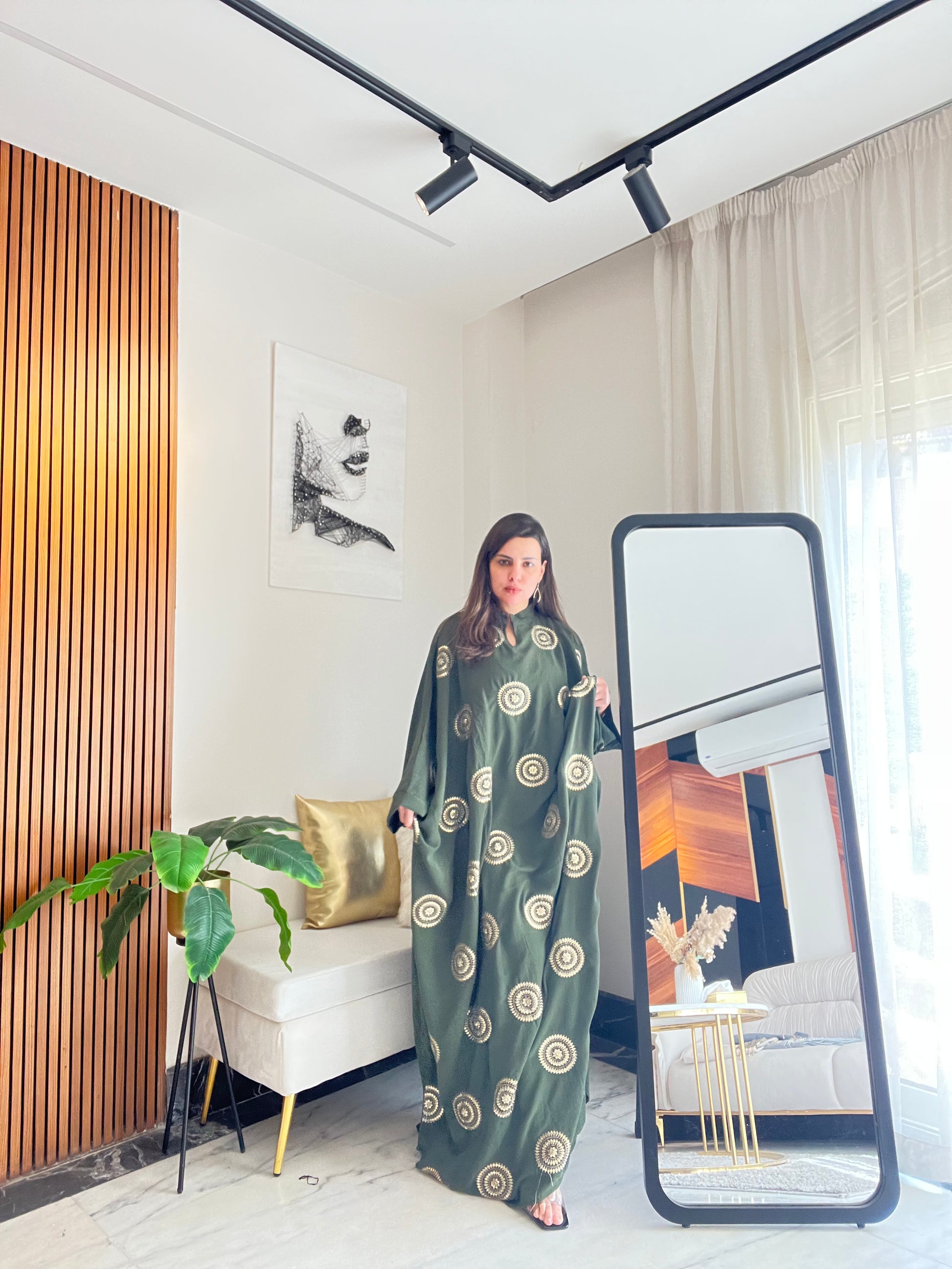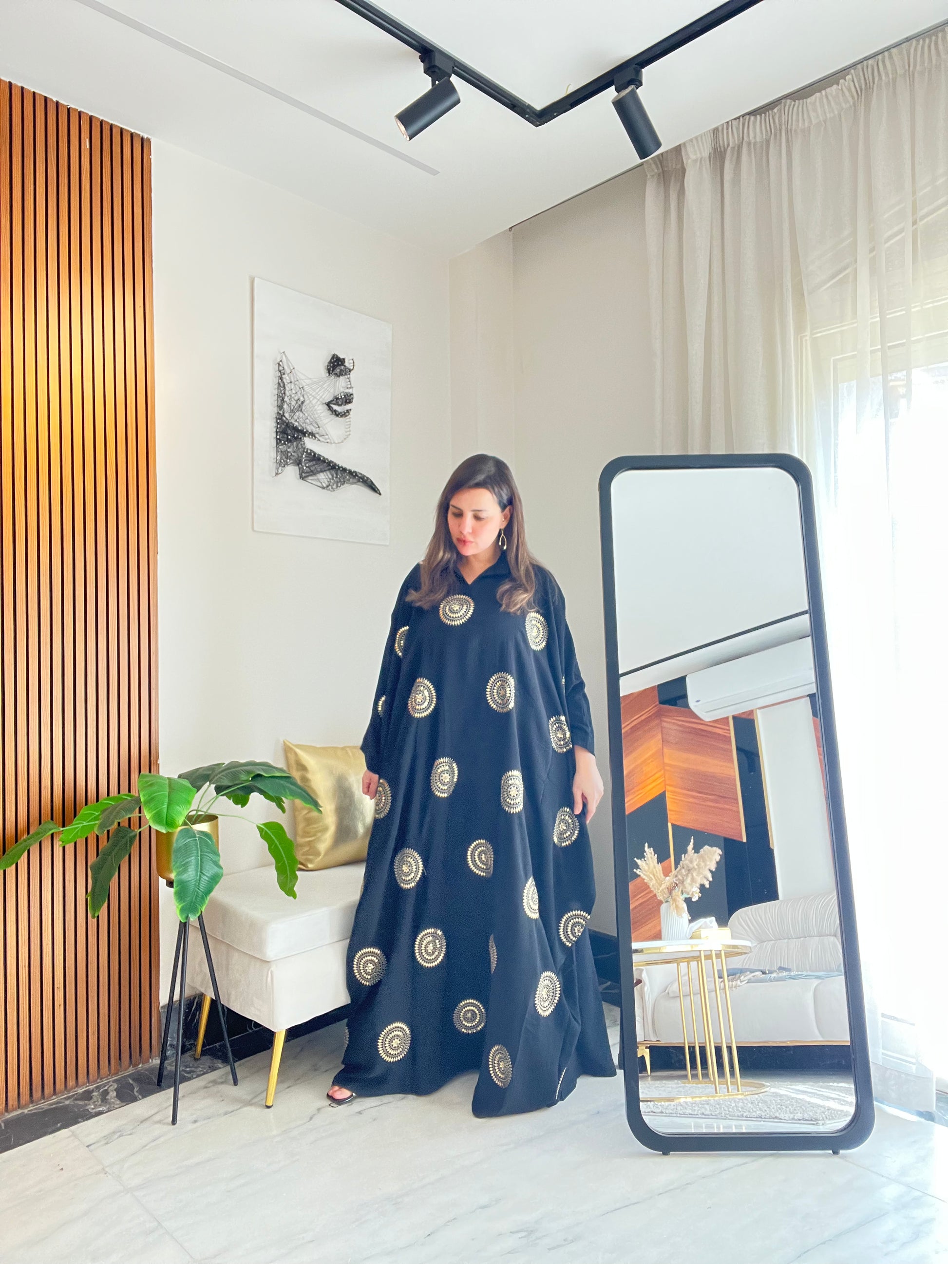 Designed to shine during special evenings, this abaya blends timeless elegance with a refined festive touch. The flowing silhouette offers comfort and grace, while the delicate gold details add a luxurious glow that feels perfect for Ramadan gatherings and evening occasions.