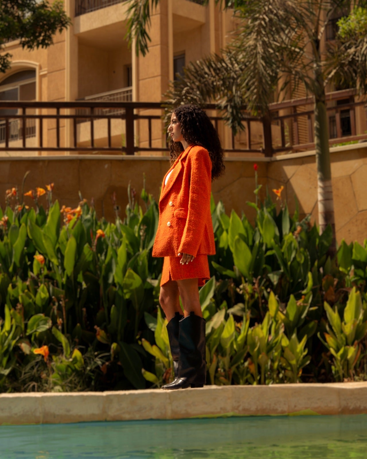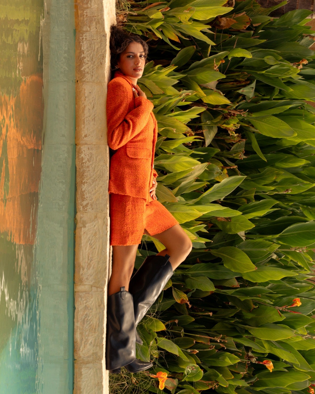 Elevate your wardrobe with this double-breasted blazer in luxurious orange tweed. Designed with structured shoulders and a tailored waistline, it brings a refined yet modern edge to your style. The gold-tone buttons and front flap pockets add sophistication, while the soft inner lining ensures all-day comfort.